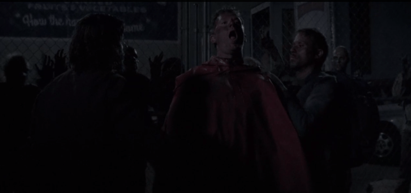 red poncho guy 2 Published May 25, 2015 at 1080 × 508 in The Walking Dead, Season 5, Episode 16, “Conquer” Repeating his words to Morgan, earlier that day, the dark-haired one tells the Red Poncho Guy, “Just be still…just be still.” The blond one turns the Red Poncho Guy around and slashes his neck with one swift stroke of his curved scythe.