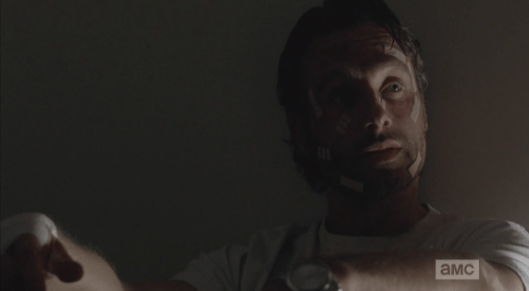 rick is telling stories Published April 26, 2015 at 592 × 326 in The Walking Dead, Season 5, Episode 16, “Conquer” Rick turns the baby blues up to Michonne. “It moved fast…and then Noah,” he says, by way of explanation.