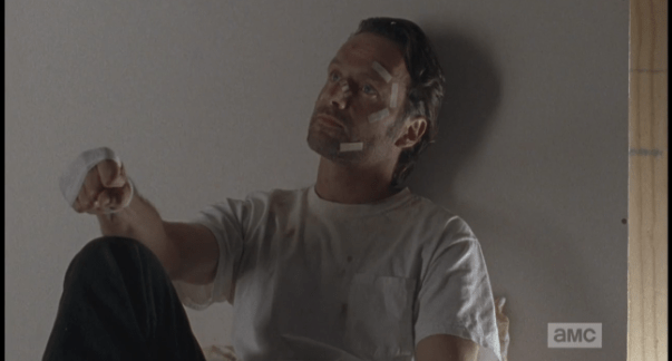 rick takes this all in Published April 27, 2015 at 603 × 324 in The Walking Dead, Season 5, Episode 16, “Conquer” Rick takes this all in, his fingers working. How are you enjoying this nice little war you’ve started so far, Rick Grimes? Any 20/20 hindsight kicking in yet?