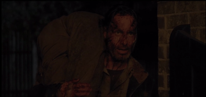 rick w walker 1 Published May 26, 2015 at 1102 × 520 in The Walking Dead, Season 5, Episode 16, “Conquer” Bloody Rick has finally made it to the meeting, and he’s brought Deanna a present…