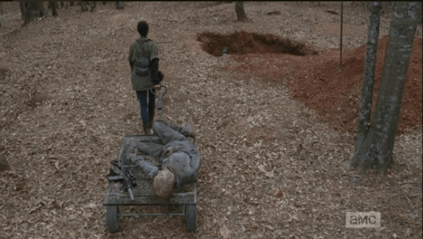 sasha cleaning up walker bodies Published April 27, 2015 at 594 × 336 in The Walking Dead, Season 5, Episode 16, “Conquer” Sasha is doing the lonely work of cleaning up the walker bodies she rekilled up in the tower. She loads another one on her cart and pulls it towards a deep pit that has been dug for walker burial.