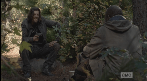 young man laughs Published April 24, 2015 at 599 × 329 in The Walking Dead, Season 5, Episode 16, “Conquer” Still laughing, the young man sits back, regards Morgan. “I like this,” he says.