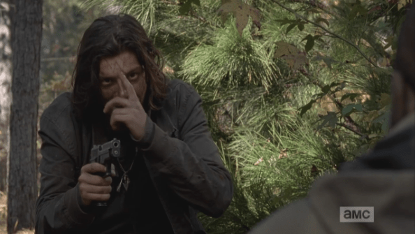 young man points to his forehead Published April 23, 2015 at 594 × 335 in The Walking Dead, Season 5, Episode 16, “Conquer” The young man then points to his forehead. “They’re back, now,” he informs Morgan.