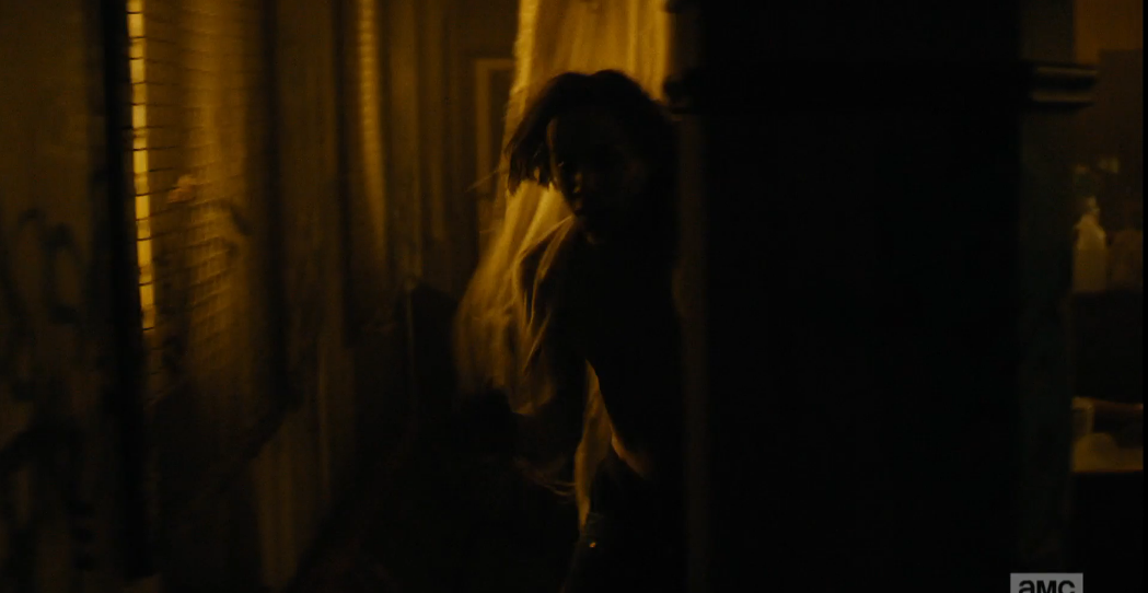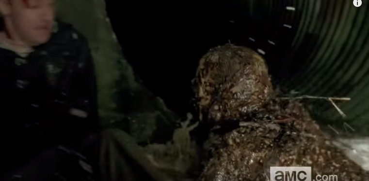 We see a shot of Aaron and Maggie, shining flashlights in the water or sewage pipes…maybe some rotting walkers have gotten in the water supply…we see a close call of Aaron slipping as a rotted walker claws towards him in the piping. Yikes!