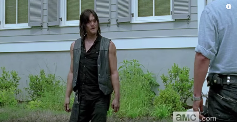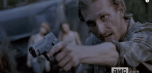 Daryl, who is tied up, lying against a tree, tells the man, “I ain’t who you think I am.” The man responds by pulling the safety on the gun and holding it closer to Daryl’s head…