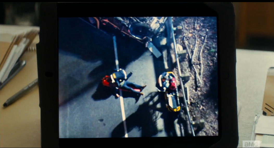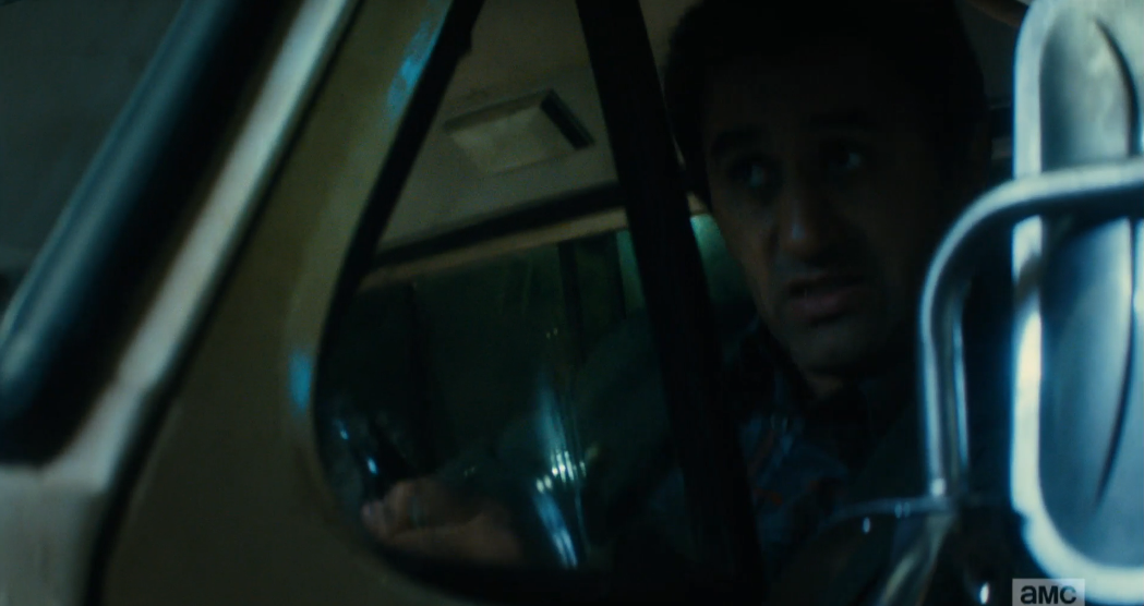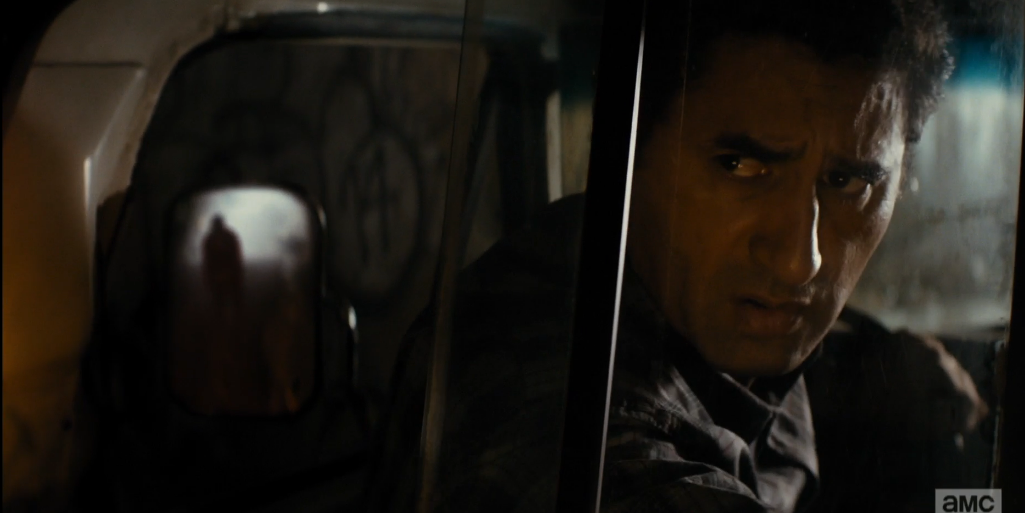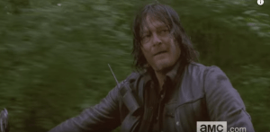 We see a shot of Abraham, leaning out a shotgun side car windown, bellowing, “Don’t do it, man!” as our man, Daryl Dixon, speeds ahead on his motorcycle…charging something…or, someone, it seems.