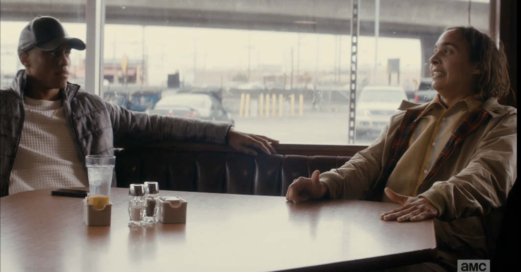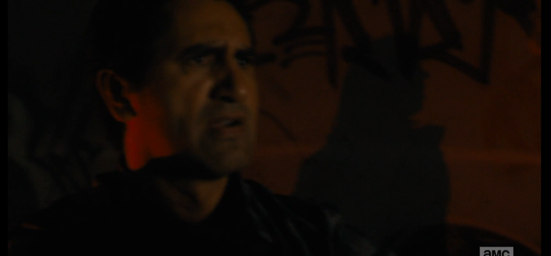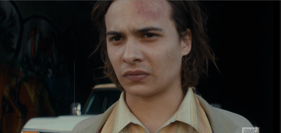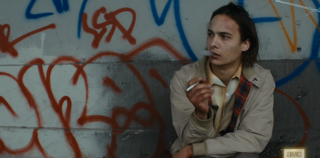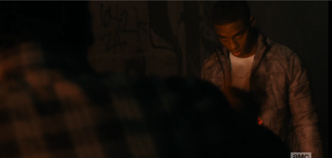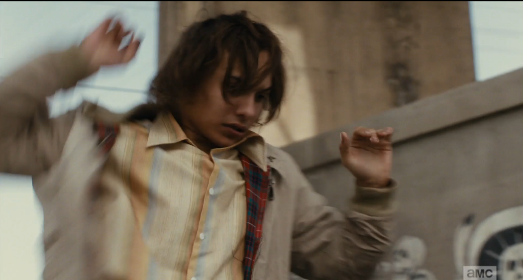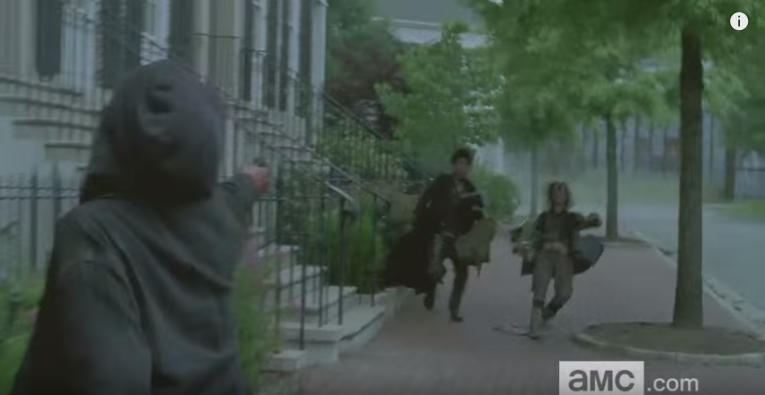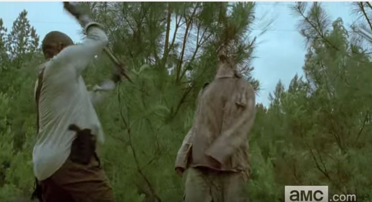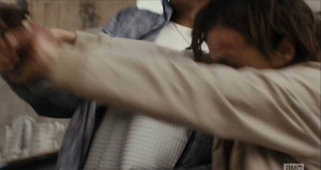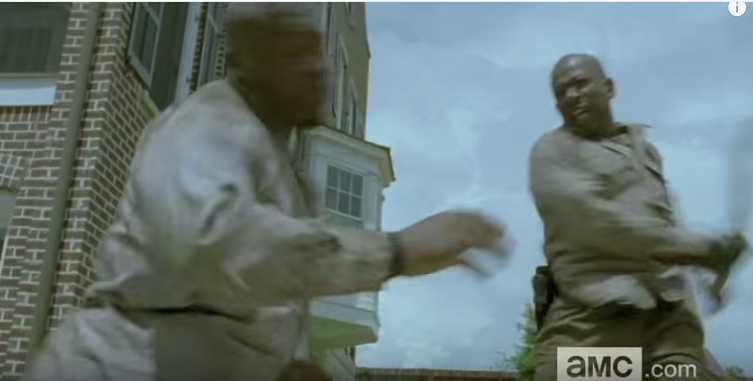 TWDfan theorists also echoed my suspicions that this individual who Morgan is smacking the fuck down looks more like a live person than a walker…a live member of the Wolves, perhaps. It is also being suggested that Morgan’s“Get outta town”scene is being spoken to a member of the Wolves, not Rick. <whew!>
