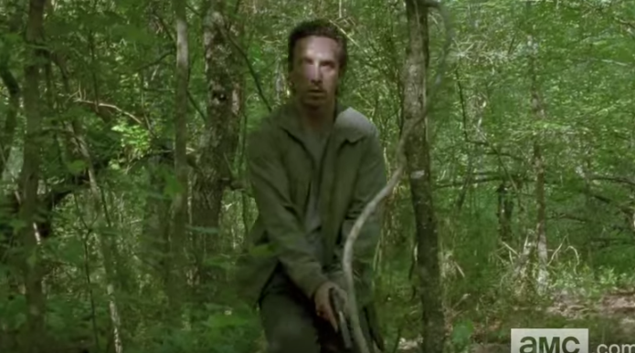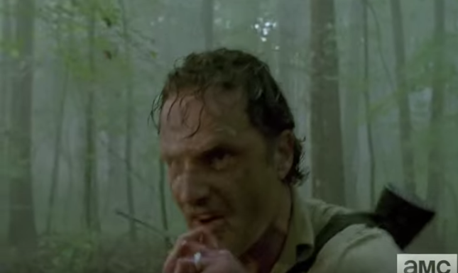 We see a shot of Rick, offing a walker in the woods, in his beautiful berzerker-style, then we see…