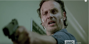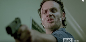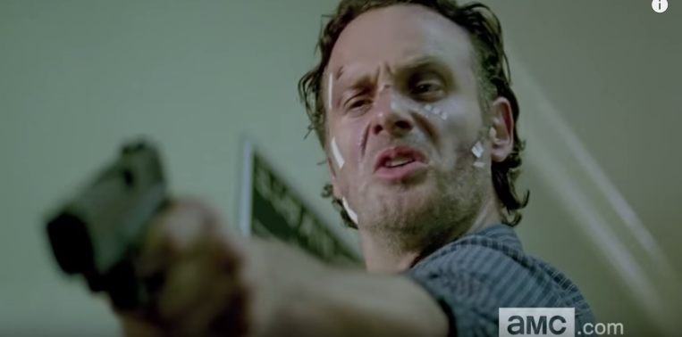 The Season 6 preview then shifts to a brief shot of Rick, face bloodied, in the moment before he pulls the trigger and puts a bullet McBeaty’s brains. We hear Morgan’s voice, “I’m a killer, Rick…and you are, too.” The gun blasts, and the screen goes black…