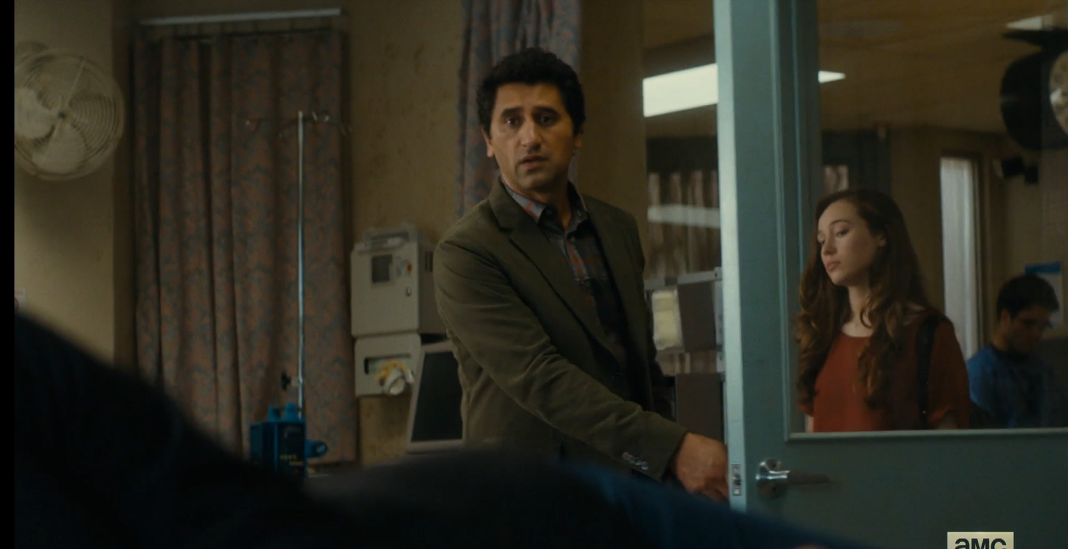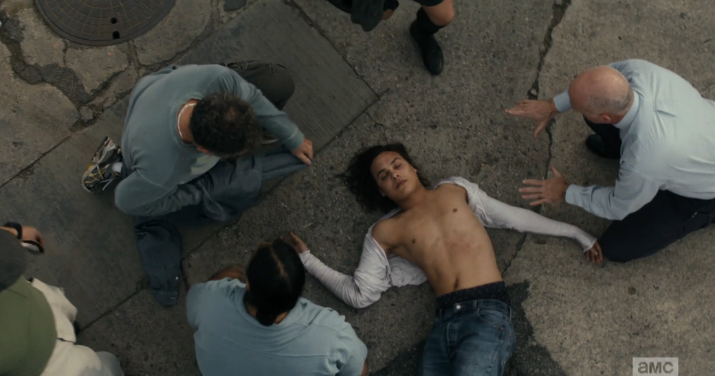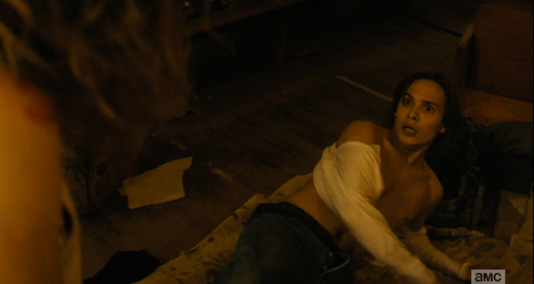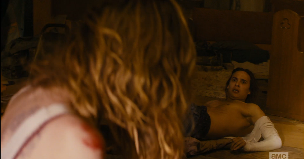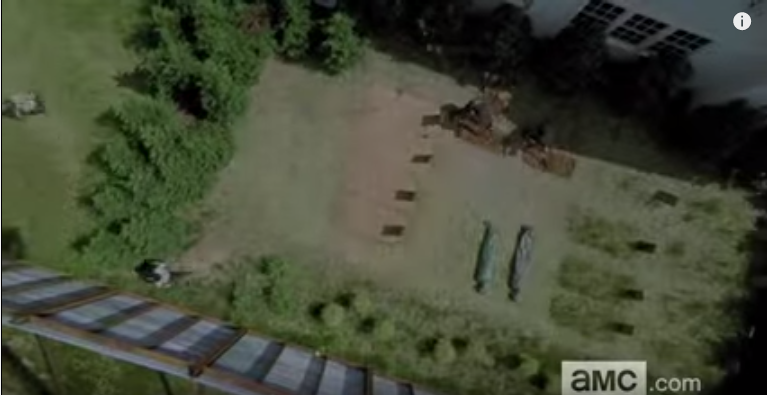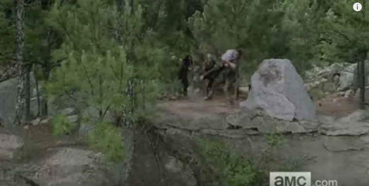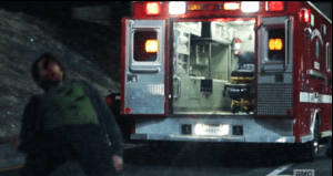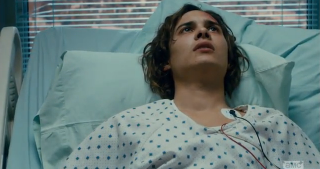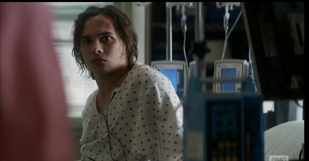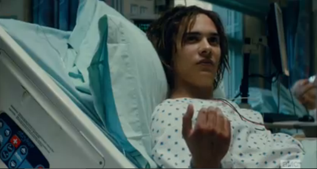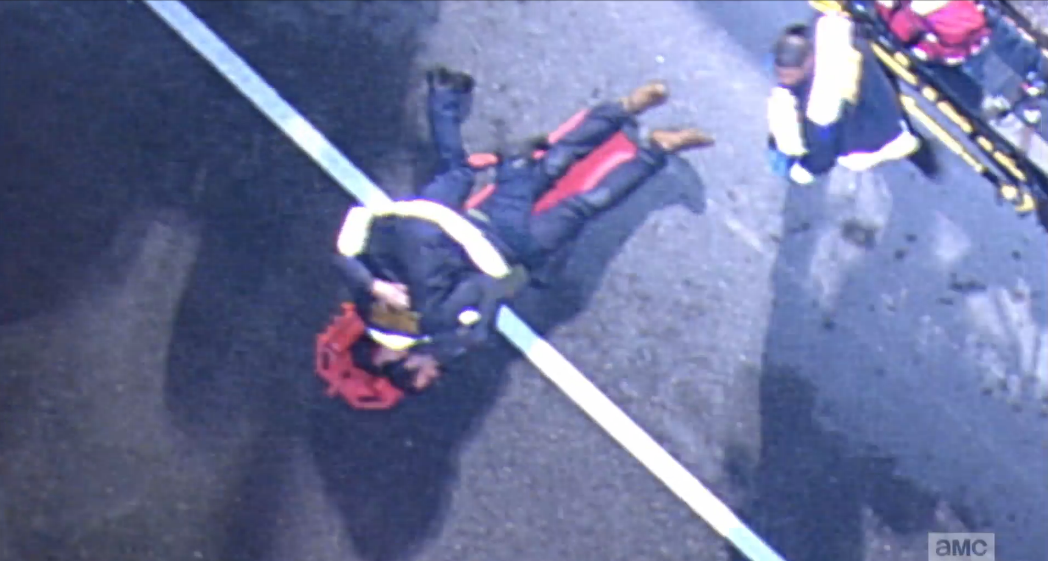 This sequence is followed by a shot of what looks like Alexandria’s infirmary, with Aaron and others holding some poor person who looks like they may have been gored by a walker attack, or a live Wolf attack…