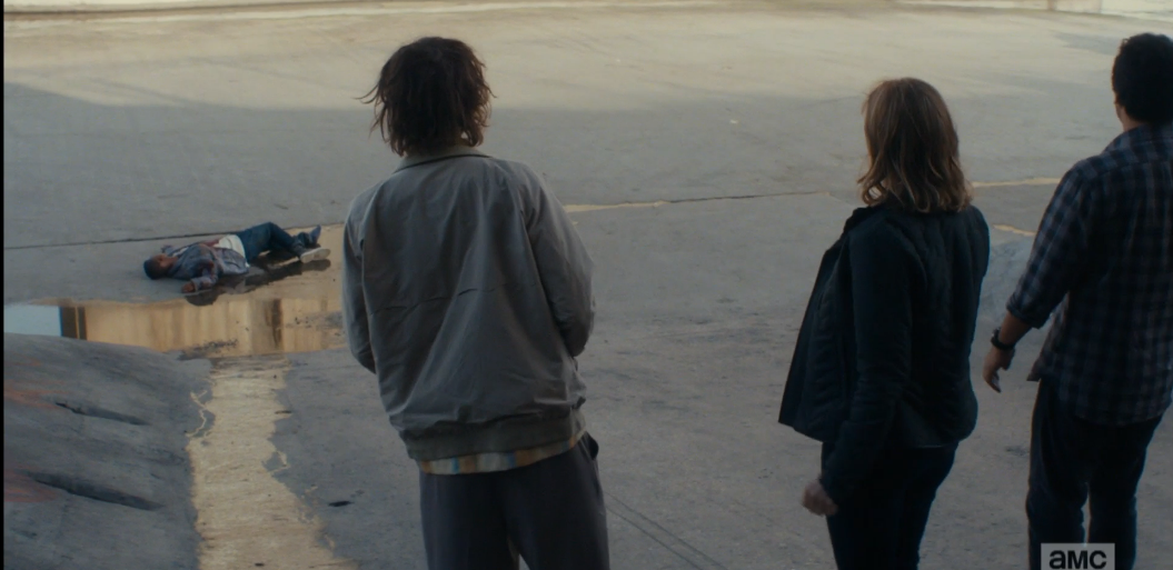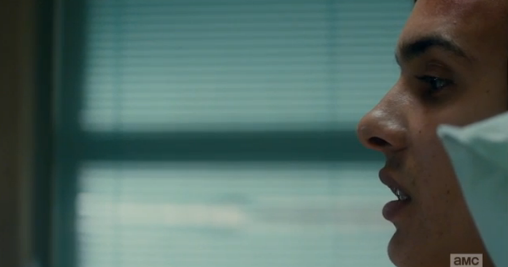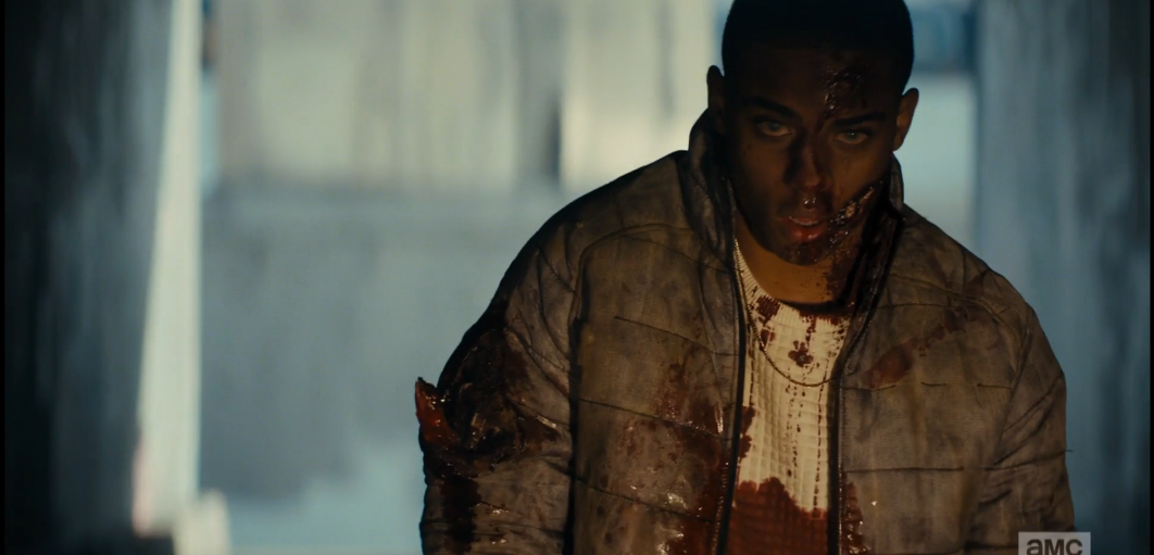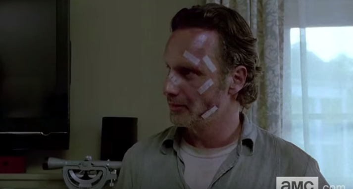 In the next shot, we see Rick, face still bloody, tell Morgan, “I don’t take chances anymore.” This scene seems to be taking place immediately after McBeaty’s execution, and Morgan’s untimely arrival to Alexandria.