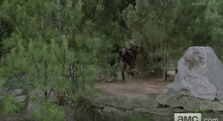We see a shot of a figure running through the woods, who looks a bit like Carol, and then we see a shot of Rick, running though the woods, barking orders into a walkie…