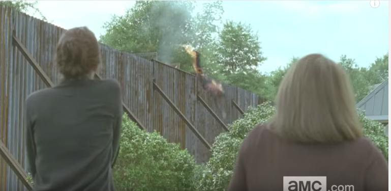 Perhaps street vigilante justice will now reign in Alexandria… “Those dirty bitches never took their trashcans in after garbage collection day…ever! And they never fucking recycled!” (Joking aside, upon further investigation upon my intuition, I believe now, as do many others, that the above picture shows Cape Carol blowing away two live members of the Wolves who have broken into Alexandria and are killing hapless citizens, looting…you know, just doing their Wolf-thing. Cape Carol sez, “Not on my watch, punk-ass bitches!“)