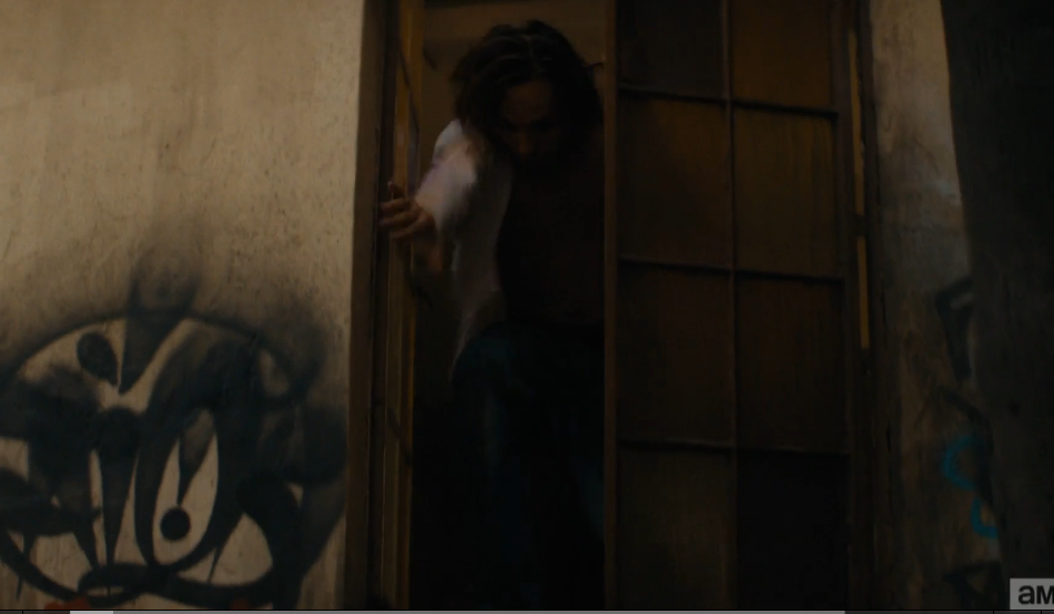 Next, we see a shot of Michonne’s face as she peers through the slats of some sort of barricade…we see the shadowy movements of many figures through the slats…
