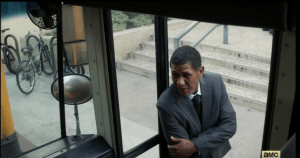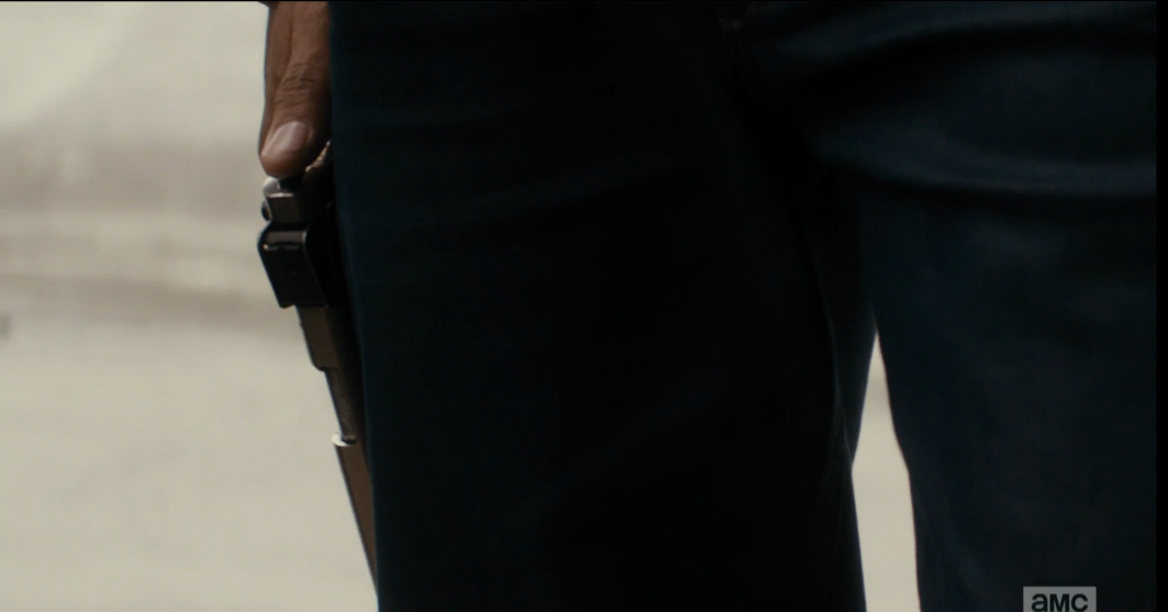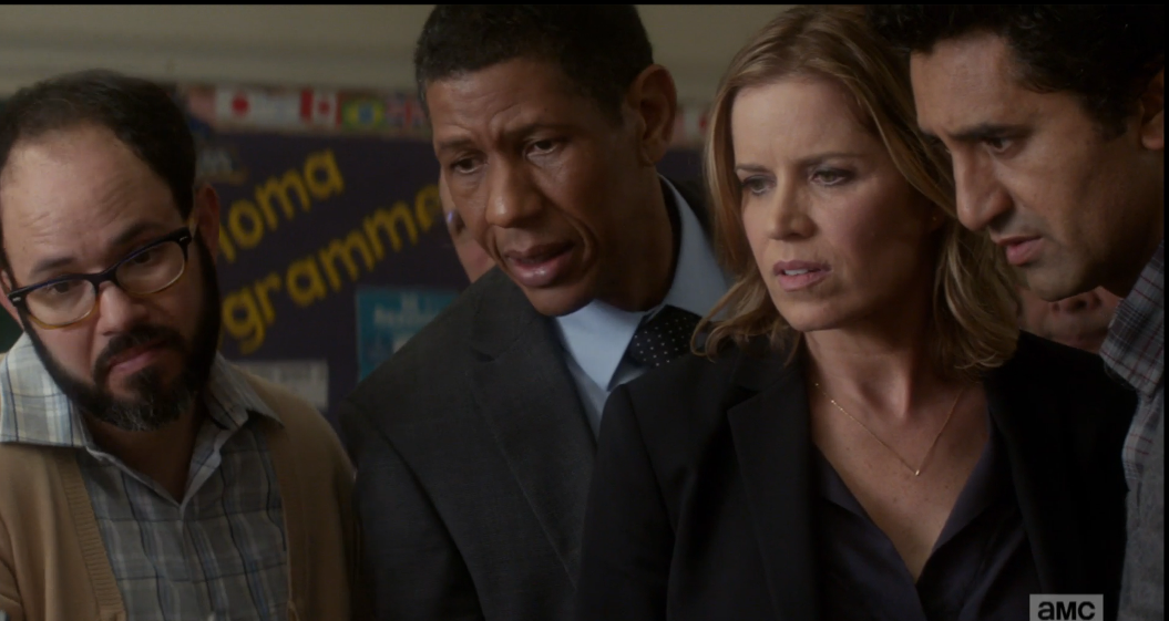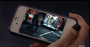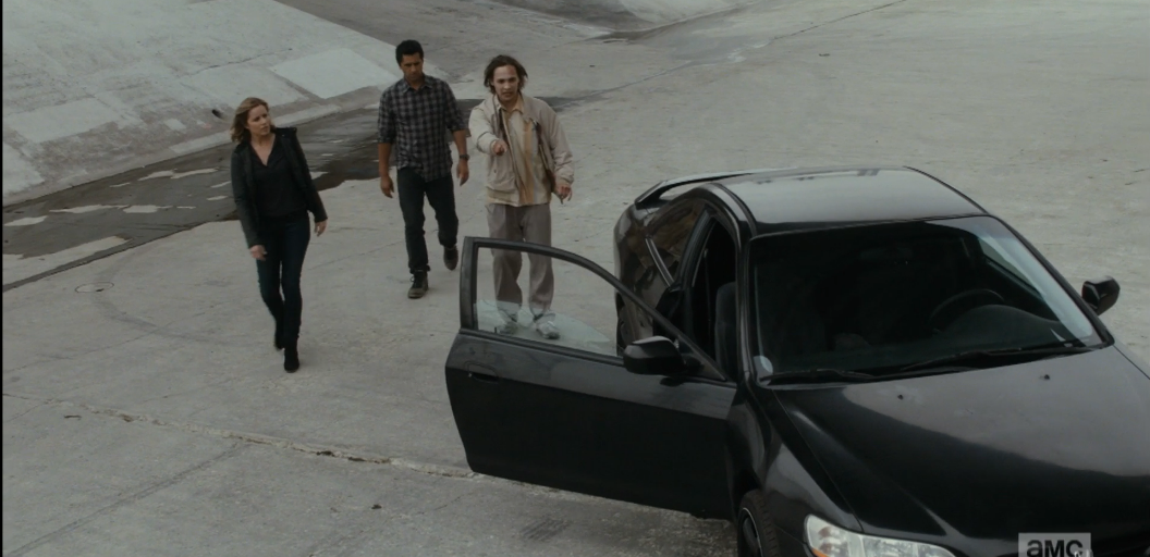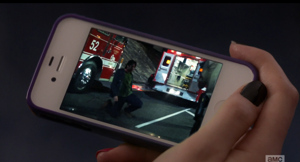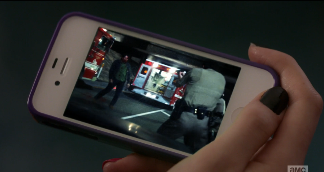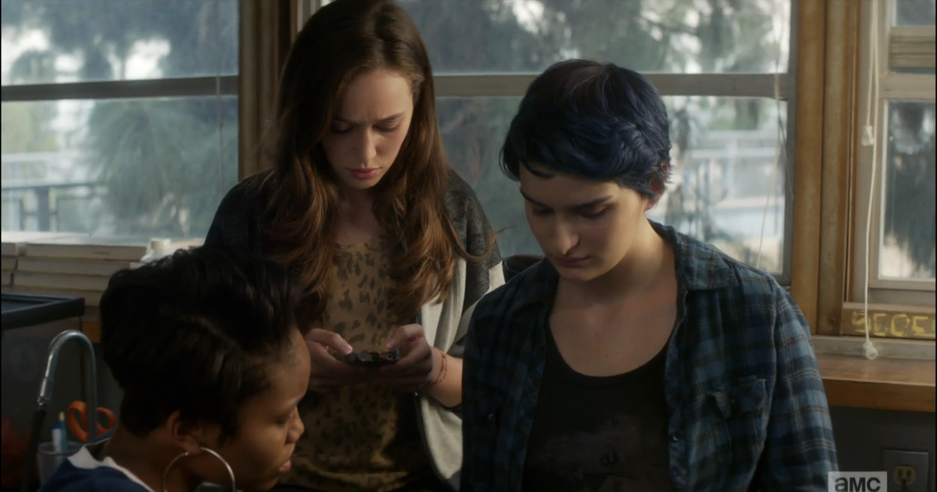 While rewatching this episode, I wondered about the technology featured in it, especially as the teachers/students watched the online leak of the reanimated traffic accident casualty on their computers and cell phones. The iPhone that Alicia’s classmate was holding as they watched did look like an iPhone 4s, which had not come out yet as of 2010, when The Walking Dead television series debuted. Online speculation about this element of FTWD puts the time of the zombie/walker apocalypse’s inception at Fall/Winter 2012. Cool time warping, compliments of Kirkman and Co., right?