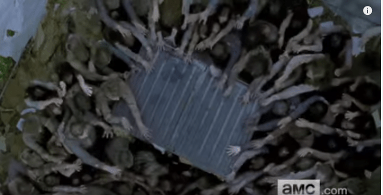 walkers surround box Published August 19, 2015 at 768 × 392 in barnfullawalkers v. The TWD Season 6 Trailer: The Breakdown Walkers swarm around a metal dumpster, or container box…presumably someone has taken cover in there.