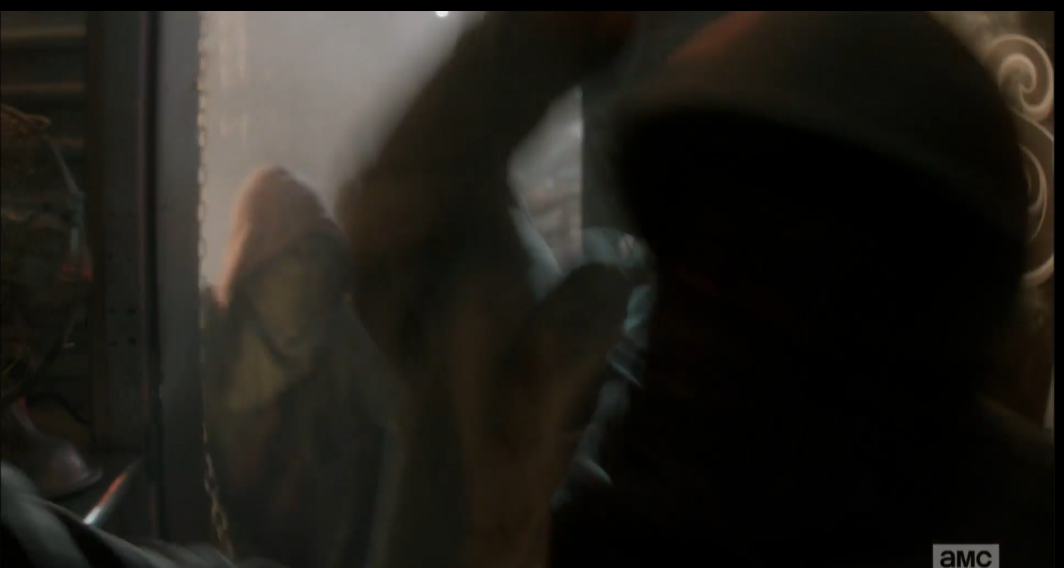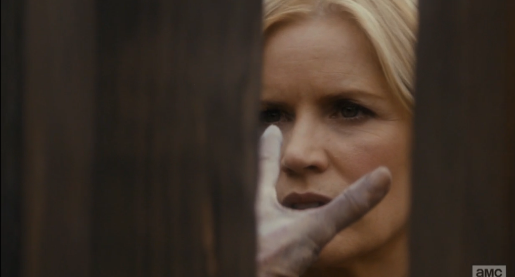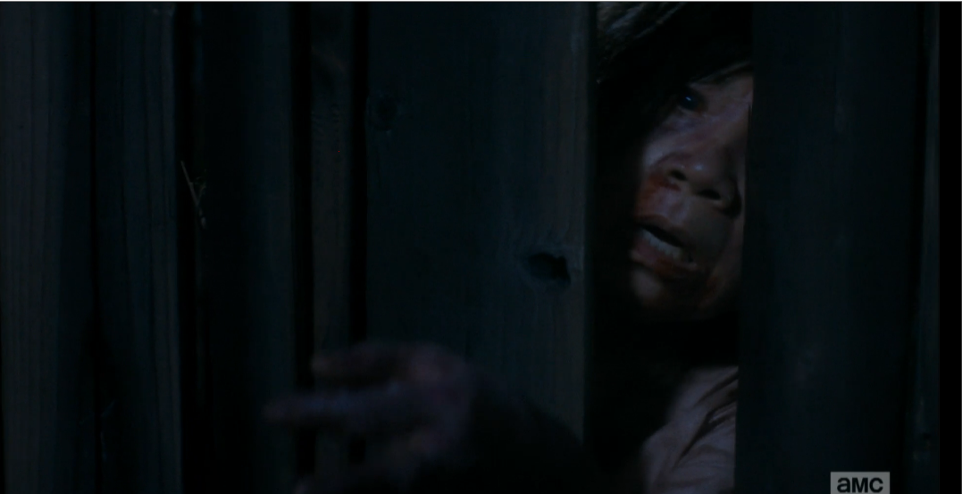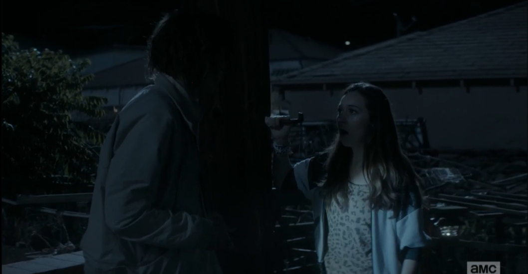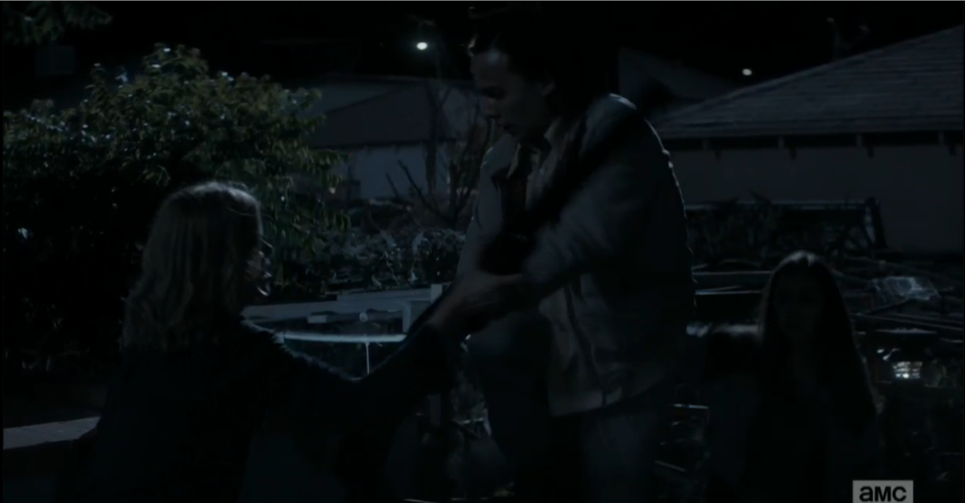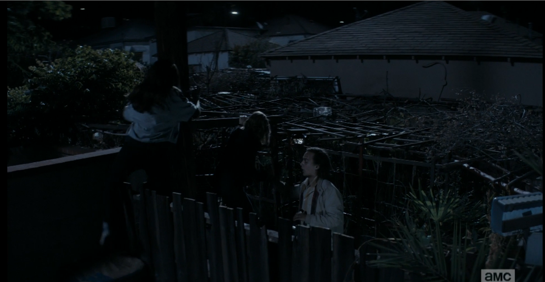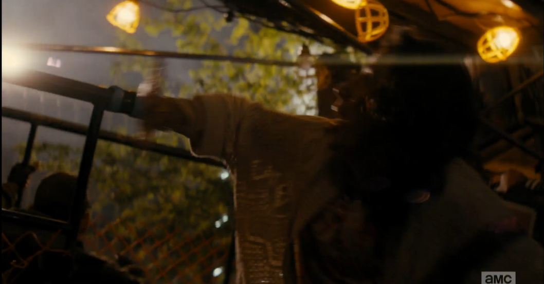 The sounds of Travis’s shovel spearing the earth get Su Su B.’s undead attention, and she comes to the opening in the fence…surely, she has been wandering the labyrinth all night, if not peering and reaching through the fence towards the house of the living.