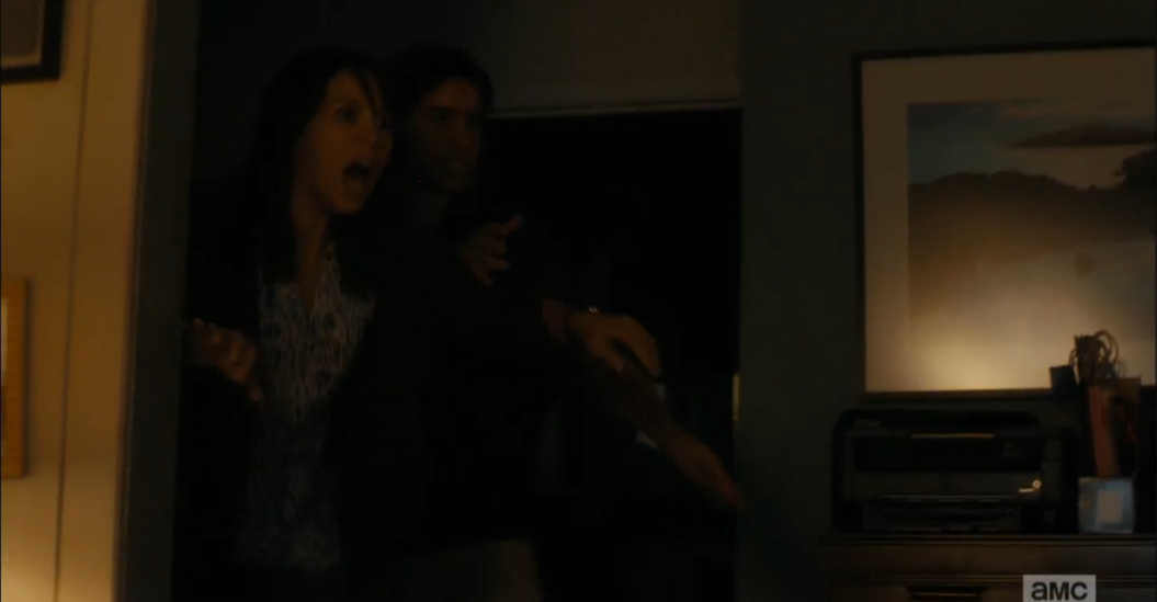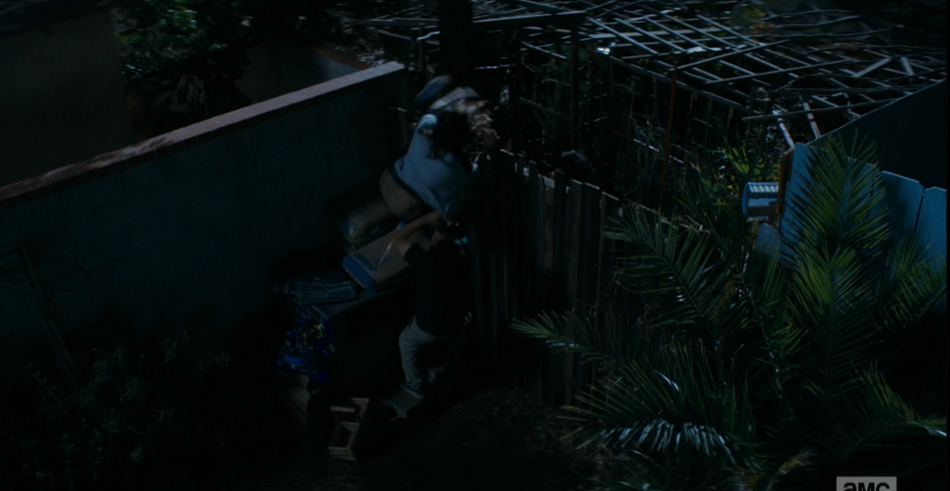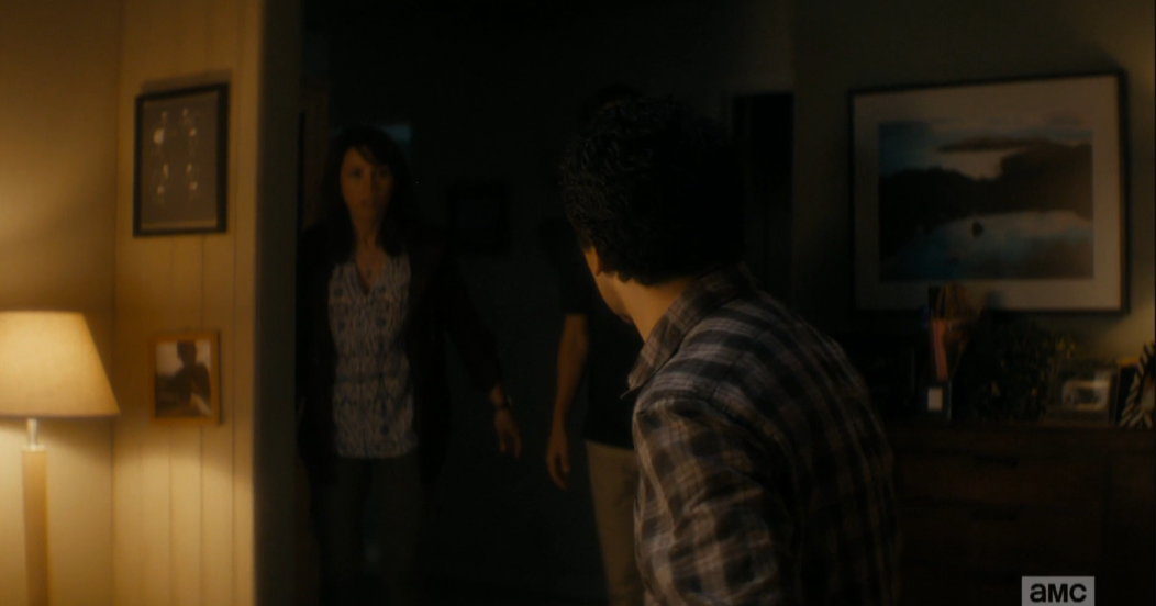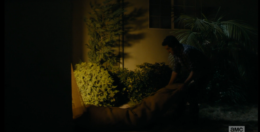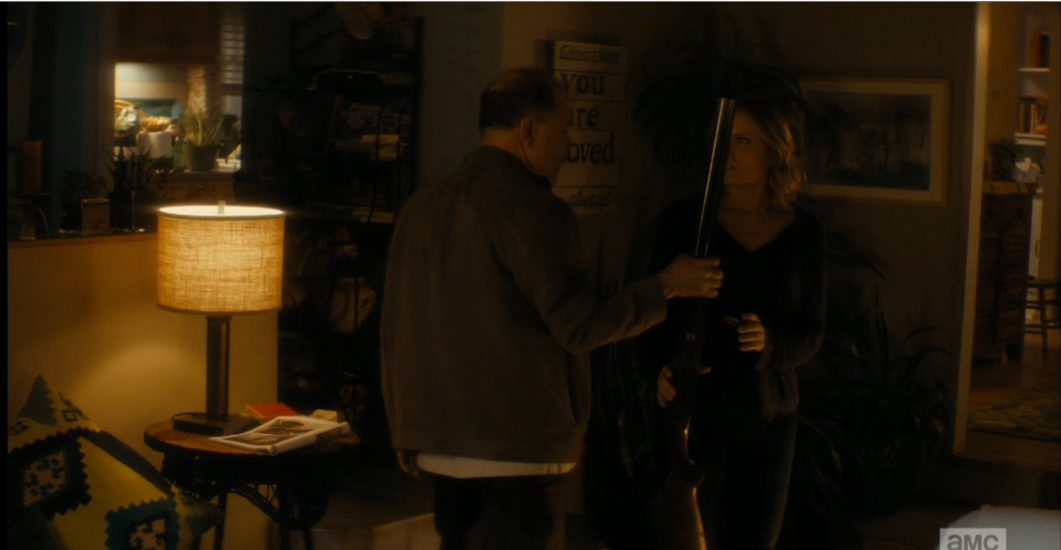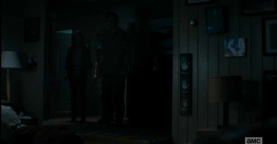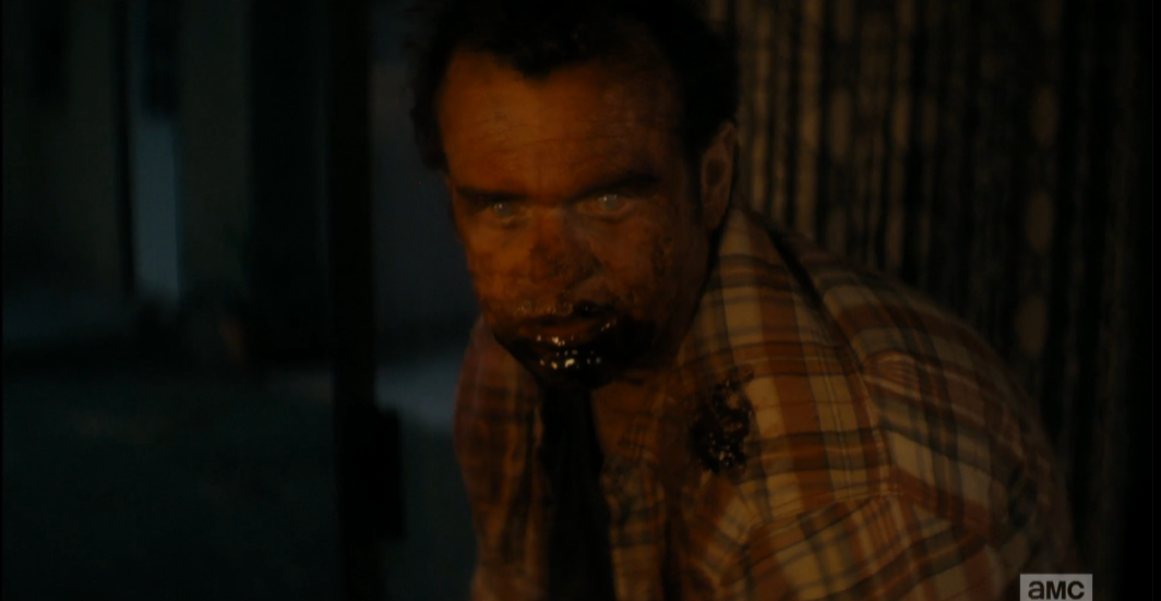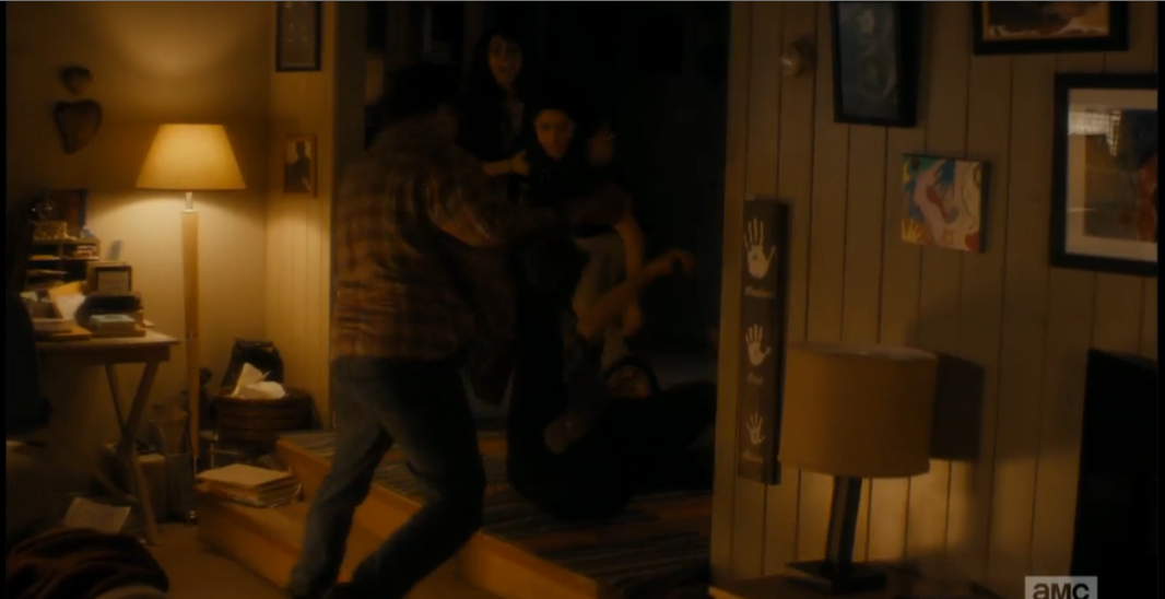 …as well as the fact that he would even walk closer towards this scene. But, upon some more reflection, after rewatching this episode, I came to the opinion that the character of Travis is one who needs to see something for himself, as close up as possible, for him to feel like he has a grasp of what is going on with a situation. He demonstrated this trait when he went to the junkie church in the pilot episode, and so, in my opinion, it’s consistent with his character to be doing this, now. I also feel like Travis is giving the slight chance that Dawson is merely sick and delusional, deranged, even (um, obviously), and that exploring that chance is worth one final effort. But, dude, seriously, grab a poker or some shit…just in case you need it! (Which you totally do…do peeps usually have fireplaces in L.A.?)