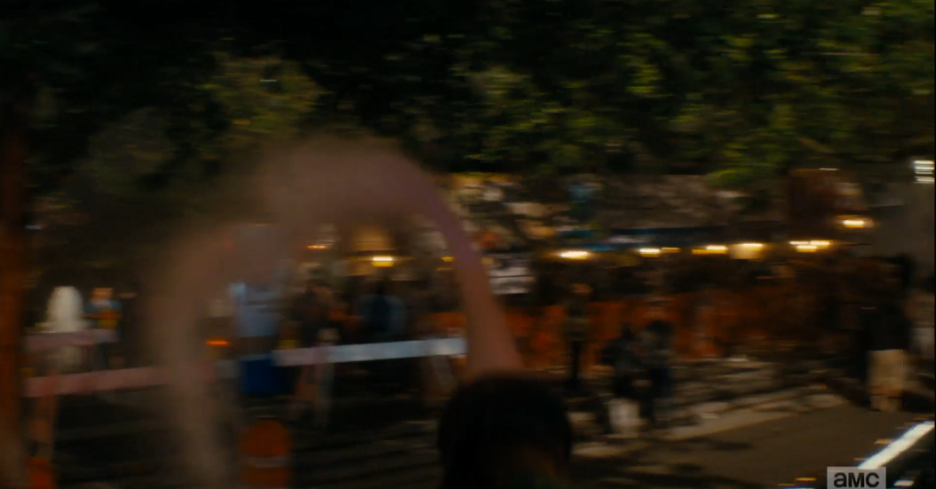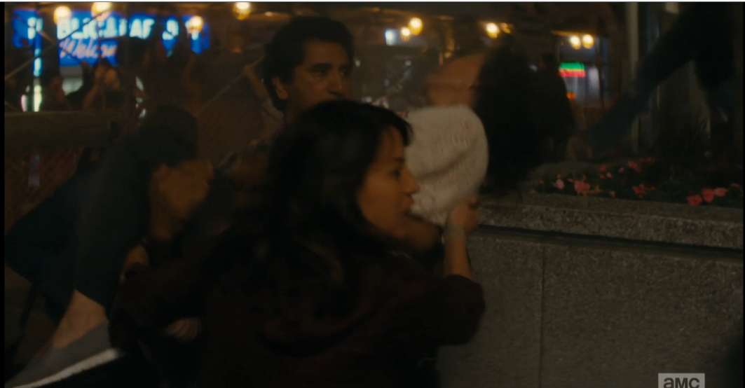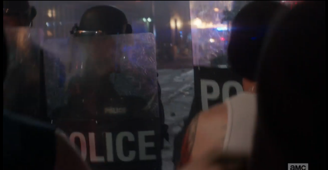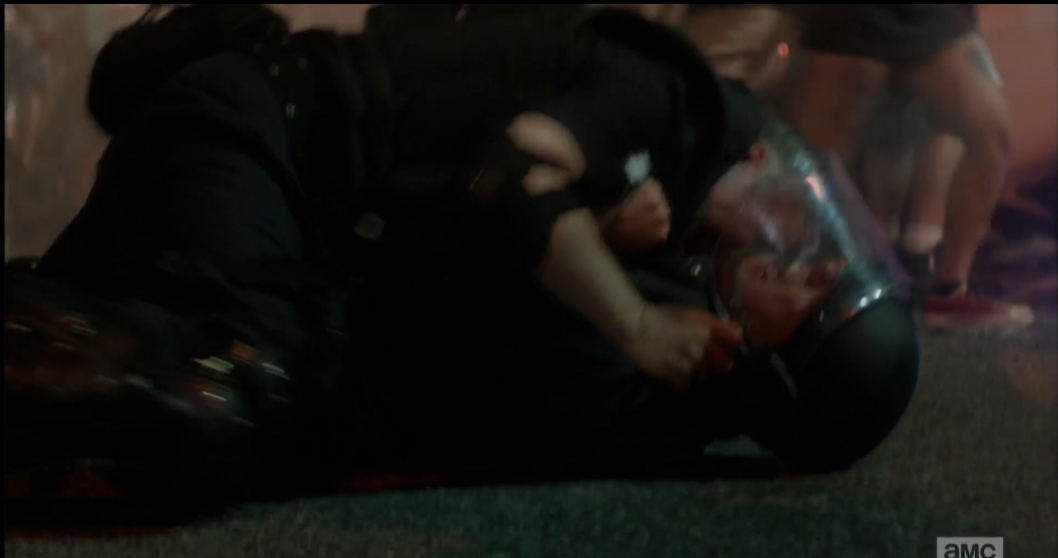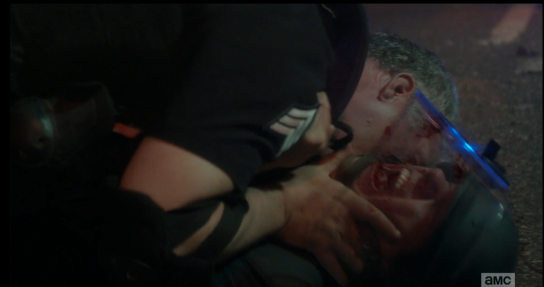 I’ve wondered many times, “How could the armed police, military not have been able to suppress the undead in the beginning of the turn?” This scene, to me, shows the strength and fury of the reanimated, as this killed-turned-cop attacks this other officer in full riot gear, pushing him down, holding him down, pushing back his face shield like a wild animal, savage, relentless…one bite is all it takes, and a moment later, we see a glimpse of the walker literally dragging the struggling cop along the ground, like a predator would drag a felled prey, before resuming feasting, as the rioters frolic around them, seemingly oblivious. Terrifying. Like, really, the naysayers can dog this show if they feel the need to, but my dreams have been weird as shit since I’ve started watching it. Beginning of the turn dreams = scary business.
