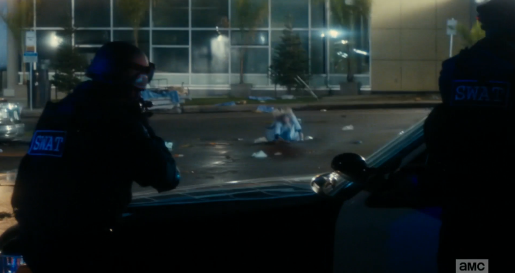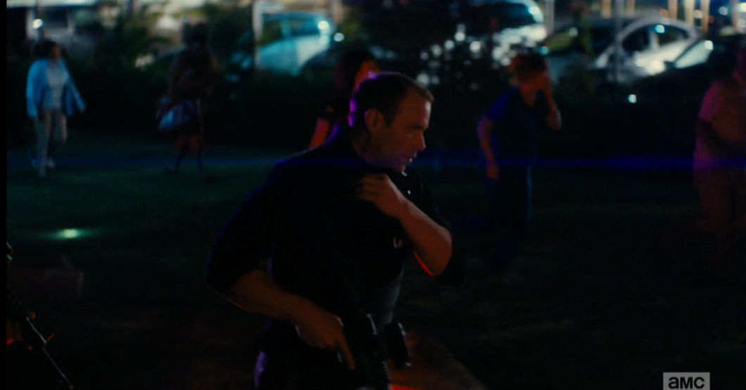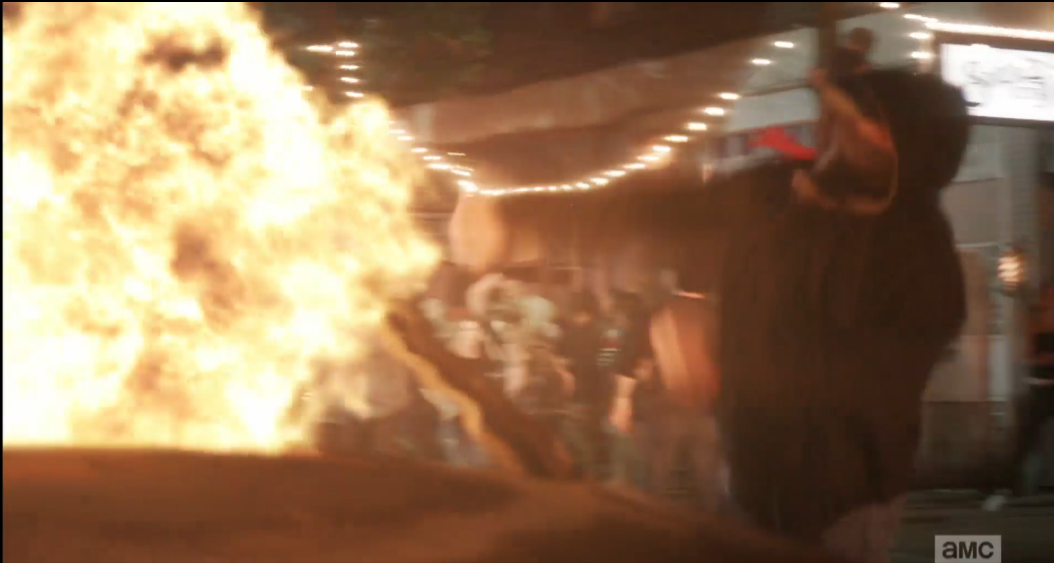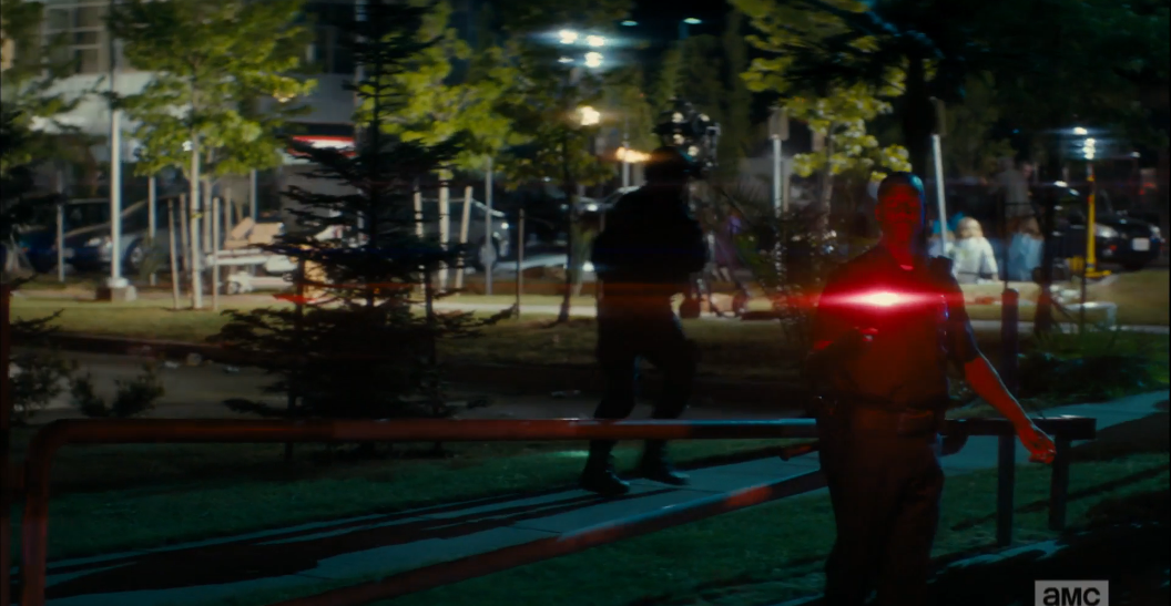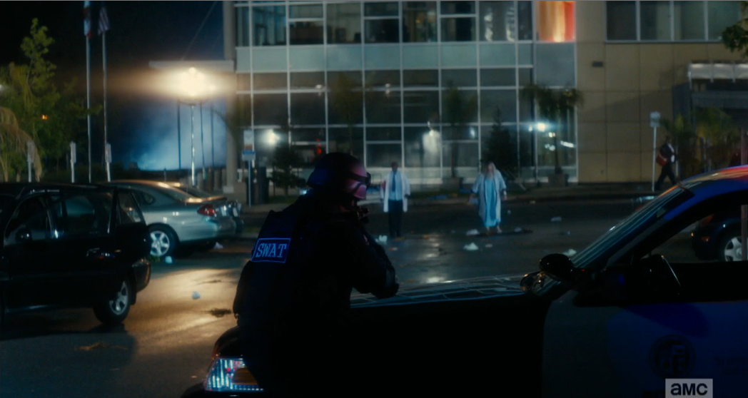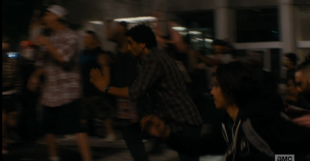 I’ve wondered many times, “How could the armed police, military not have been able to suppress the undead in the beginning of the turn?” This scene, to me, shows the strength and fury of the reanimated, as this killed-turned-cop attacks this other officer in full riot gear, pushing him down, holding him down, pushing back his face shield like a wild animal, savage, relentless…one bite is all it takes, and a moment later, we see a glimpse of the walker literally dragging the struggling cop along the ground, like a predator would drag a felled prey, before resuming feasting, as the rioters frolic around them, seemingly oblivious. Terrifying. Like, really, the naysayers can dog this show if they feel the need to, but my dreams have been weird as shit since I’ve started watching it. Beginning of the turn dreams = scary business.