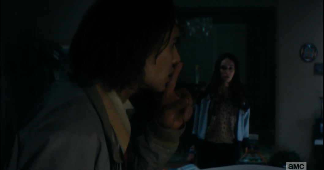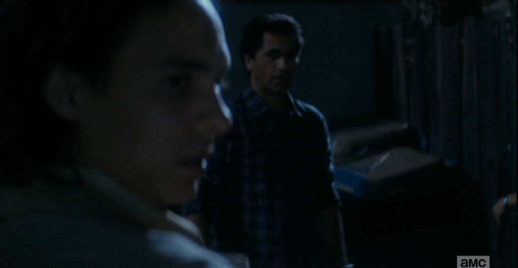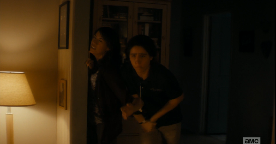 Travis hears a noise, turns to see Liza and Chris have followed him inside. “I thought I told you to wait in the car!” Travis admonishes. “We’re staying with you,” Liza replies, firmly. (I must say, I am really liking how these characters have each others’ backs, despite their histories together, and their differences…it is really endearing to me, and makes me root for them. As a mom, I am also liking the strong family bonds demonstrated in this show…they take care of each other, and the kids, while being rebellious teens, really do look to their parents for guidance and leadership when the shit goes down. Thumbs up, FTWD!)