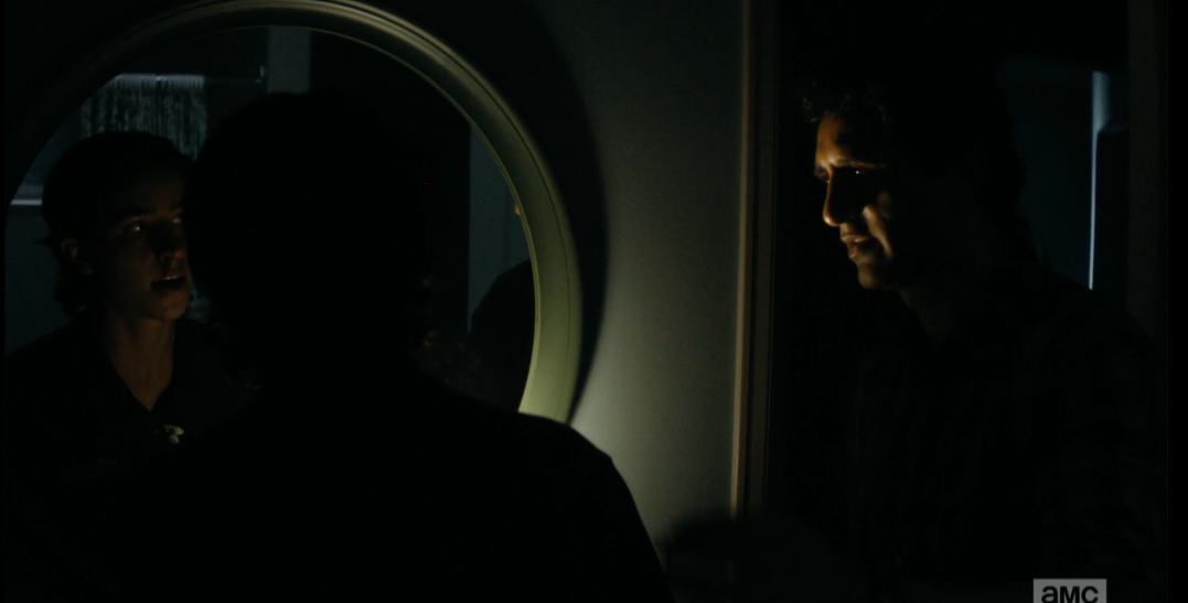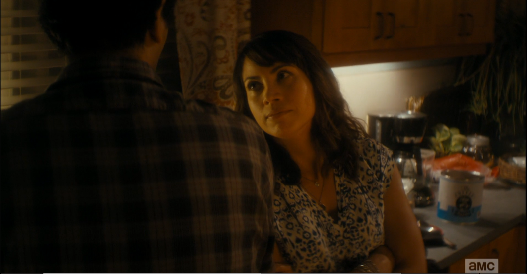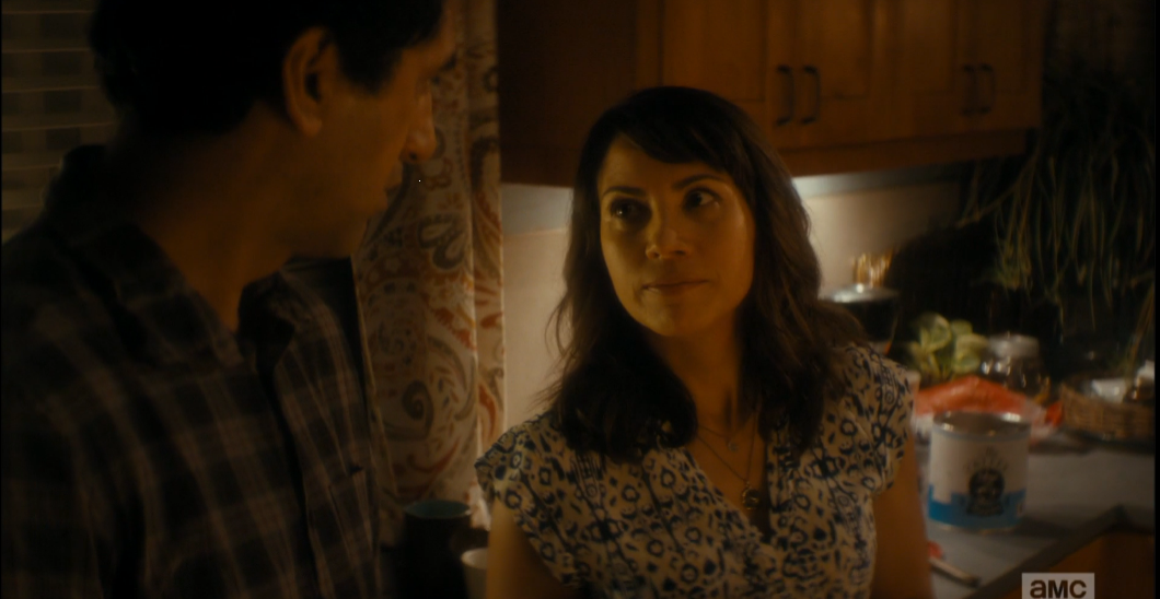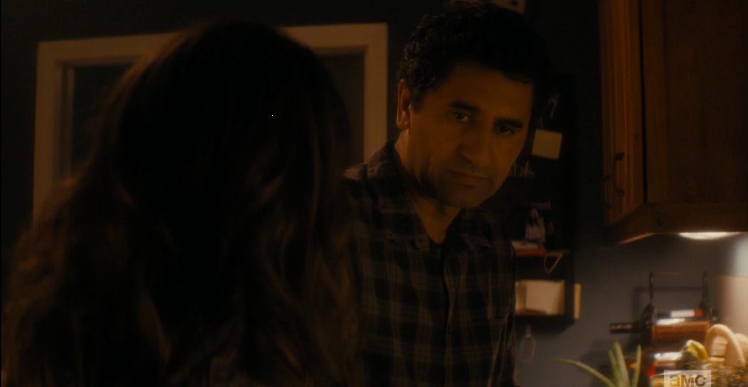 Madison, however, is no longer clinging to social niceties, and asks Travis, “Are we leaving?” meaning, aren’t we leaving right now? Travis wants to do the right thing by the Salazars, and he replies yes, first thing in the morning… Madison says unreservedly that they are packed, ready to go tonight, that they were just waiting on him to return, and they are ready to leave, now. Awkward!