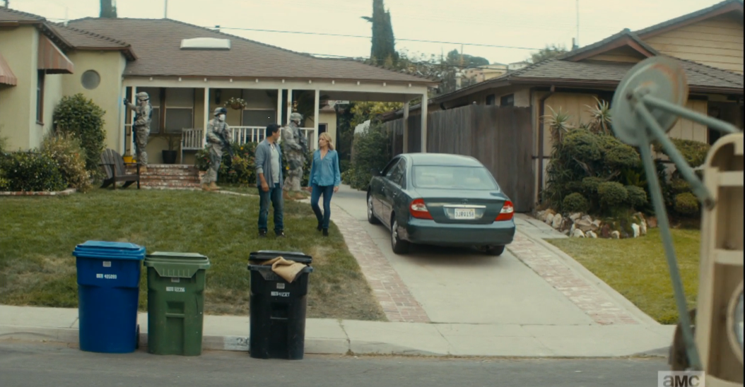Travis stands in the front yard, watching the military trucks and personnel swarming the neighborhood. Madison walks up beside him. As they stand together, watching, Travis says, “The calvary has arrived…”