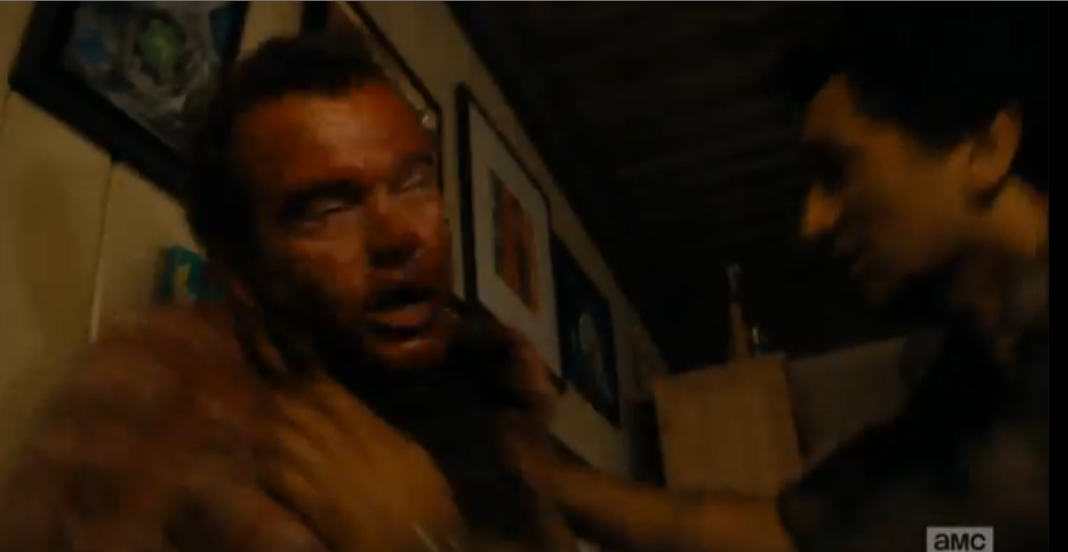 …who backs away, tries to talk to the walker, “Peter? Hey, you’re sick…Peter? It’s Travis.”