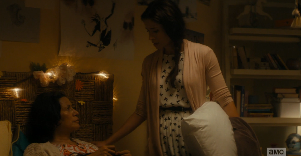 Griselda lays a calming hand on her daughter’s shoulder, and gives Ofelia a knowing, motherly look. Now is not the time to challenge Daniel on this, but another time will present itself, soon enough. Travis awkwardly tells Ofelia that they will set her mother up in the other bedroom for the night, and Ofelia thanks him.