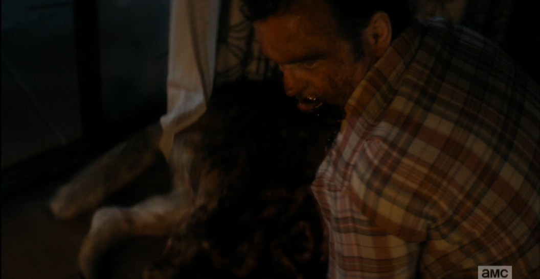 “Travis!” Liza whispers. (Look, gang, I know we’re all jaded TWD fans and shit, but really, could you imagine walking up on this scene? After the crazy day they just went through? Just a day or two before, their lives were normal…and now, this is happening. Peter Dawson’s chomping the Cruz’s dog in the living room, face down in that poor baby’s belly, feasting away, tearing flesh with his teeth, getting jiggy with it, face all covered with blood, like a wild fucking animal...and have I mentioned that my dreams have been weird as shit since I started watching this show?)