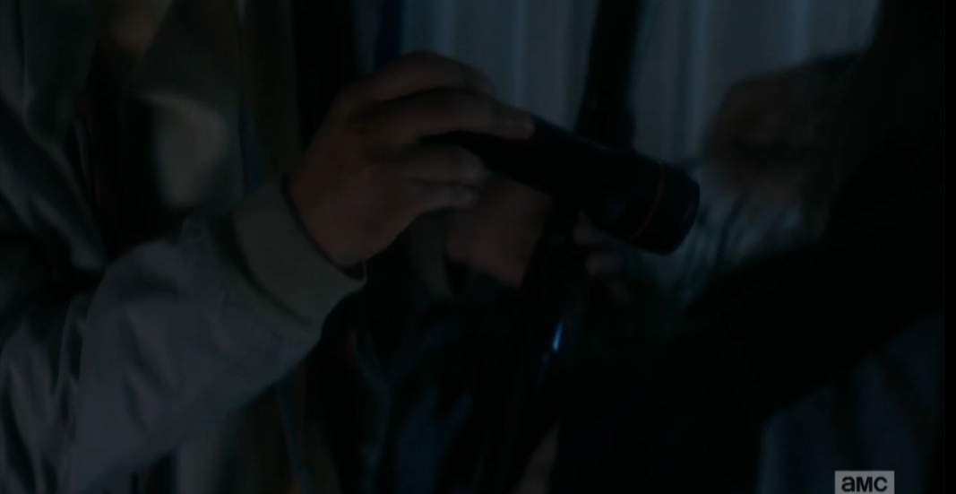 After a brief moment, Madison turns to Nick “Here, take this,” she says, handing Nick the shotgun and taking the flashlight from him.