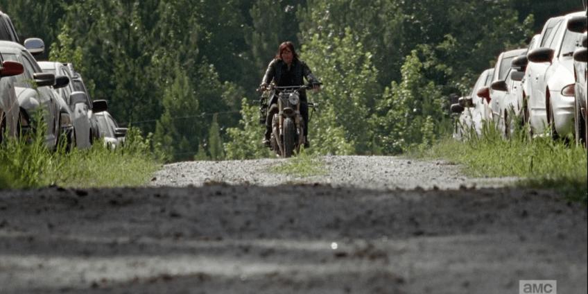 …Daryl, who coasts slowly on his motorcycle, coming up over the hill. We do not see the massive horde of walkers just a few feet behind him, yet, but we hear their savage caucophony grow louder and louder as Daryl rolls closer. Always putting himself at the greatest risk for the good of all. How we love thee, Daryl Dixon! ❤