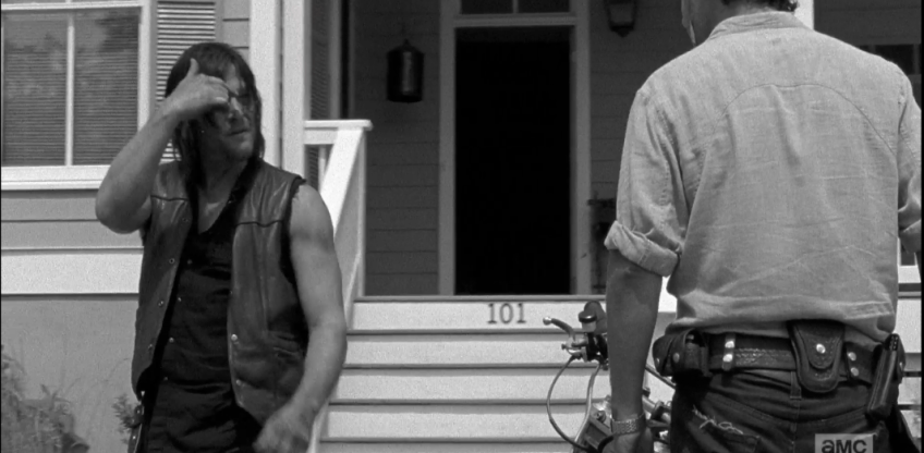 daryl bike 4 w Published October 18, 2015 at 1064 × 523 in The Walking Dead, Season 6, Episode 1, “First Time Again” “Did he tell you about those guys he met?” Daryl motions to his forehead. “W’s?”