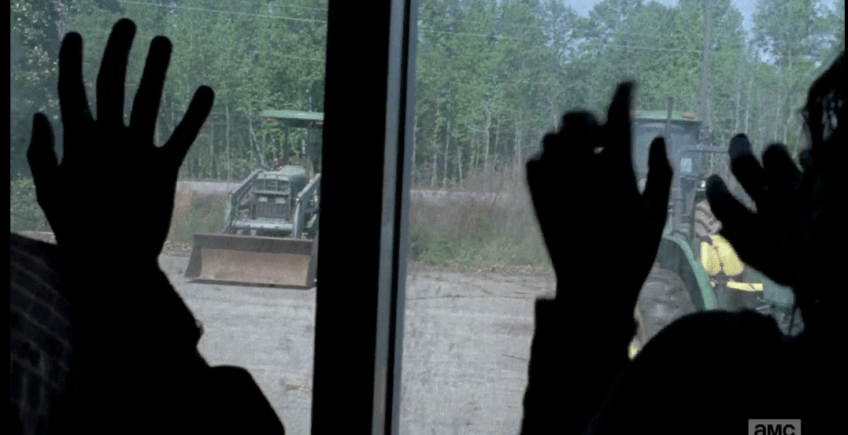 glenn tractor store 1 Published October 18, 2015 at 1077 × 553 in The Walking Dead, Season 6, Episode 1, “First Time Again” Glenn, Nicholas, and Heath have reached the tractor store, without a moment to spare. If they are too late, the noise of the tractors could distract the walker parade off the road. They must act fast.