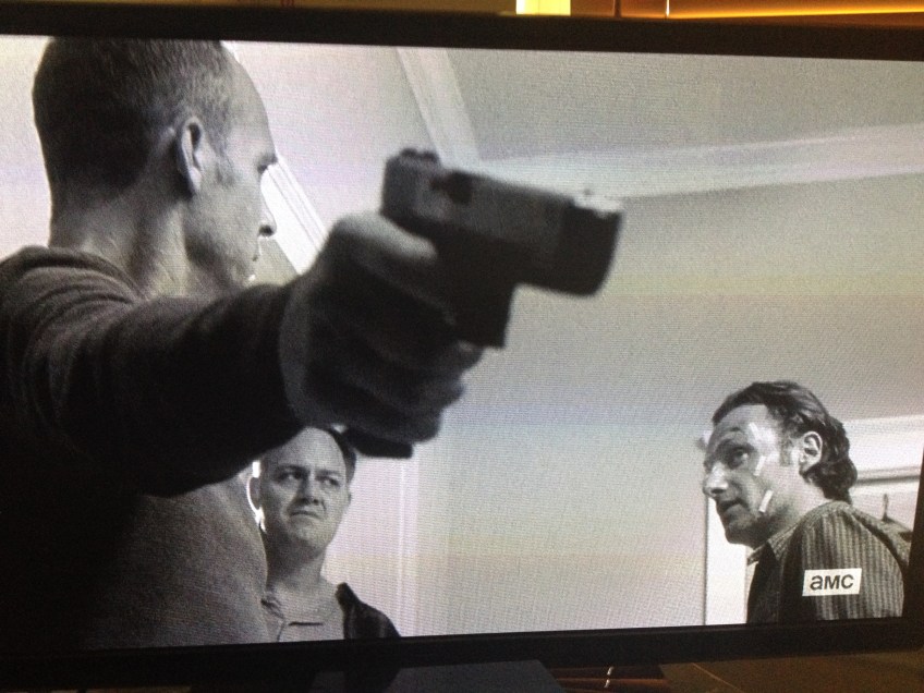 IMG_5103 Published October 21, 2015 at 3264 × 2448 in The Walking Dead, Season 6, Episode 1, “First Time Again” “…that would have been the smart thing, if I had -…” and then Rick Smash! lunges at Carter, disarming him in one swift, pimp deputy manuever. Whew, the hotness…!
