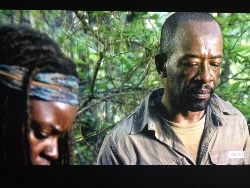 IMG_5214 Published October 22, 2015 at 3264 × 2448 in The Walking Dead, Season 6, Episode 1, “First Time Again” Michonne steps forward. They look down at the dead young man who lay at their feet. “I know it’s how it is,” Morgan says. “I do.”