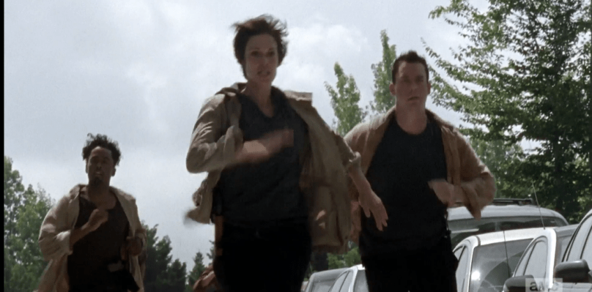 We see the newbies running while Rick-In-Charge’s voice instructs over the radio, “You all have your assignments…you know where to rendevous.” (I’d be all like, “Yessir, General Smash! I know where to rendevous, Sir!” Good thing the Newbies were regulars at Aaron’s cardio kickboxing class, back in good ol’ Alexandria!)