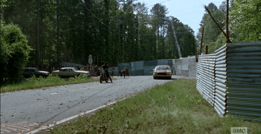 parade 2 Published October 21, 2015 at 1061 × 549 in The Walking Dead, Season 6, Episode 1, “First Time Again” As the mass approaches, Rick, Morgan, and MIchonne begin firing well-timed, well-placed flares to distract the walkers’ attention from charging full-forward into the wall, and lead them around the bend.
