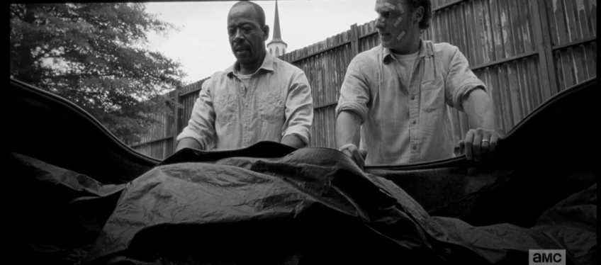 Later, as they load Pete’s body into the car trunk, Rick looks over at Morgan. “He killed Reg…that’s why I shot him,” Rick explains. “We had no other choice.” Morgan looks down at the body in the bag. “You have a cell,” he says, mildly. “Not for killers,” replies Rick.