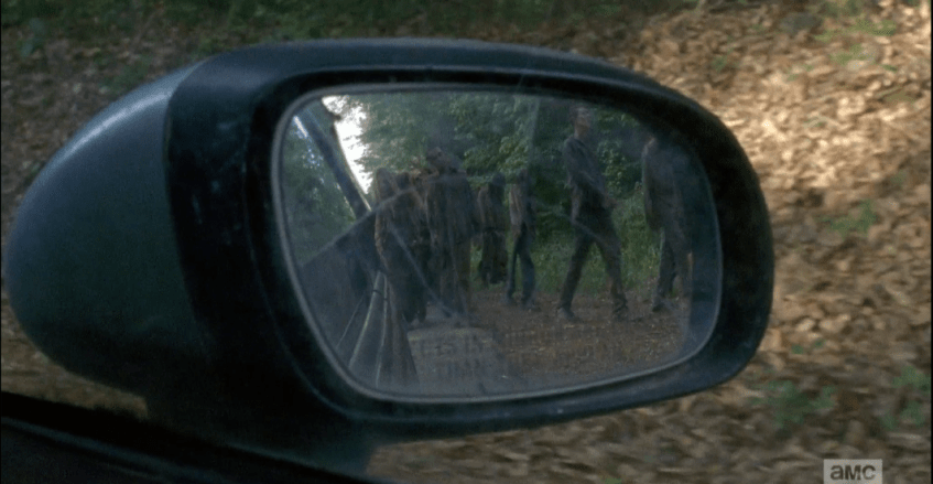 rearview 1 Published October 21, 2015 at 1063 × 551 in The Walking Dead, Season 6, Episode 1, “First Time Again” Back to the present, the Rearview Walkers seem to be going off the beaten path.