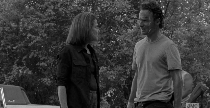 rick deanna 1 Published October 21, 2015 at 1061 × 548 in The Walking Dead, Season 6, Episode 1, “First Time Again” Back in time, at the construction site, Rick tells Deanna, “I’m sorry I haven’t had the chance to say it yet, but I’m sorry about Reg. He was smart, and kind.” Deanna nods silently.