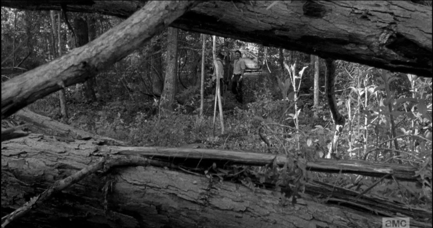 As they step their way through the woods, Morgan leading the way, trusty staff in hand, RIck prompts, “Morgan…maybe we just leave him here.” If it were up to Rick Smash!, they would have heaved the body just off the road and taken off. Later, McBeaty.