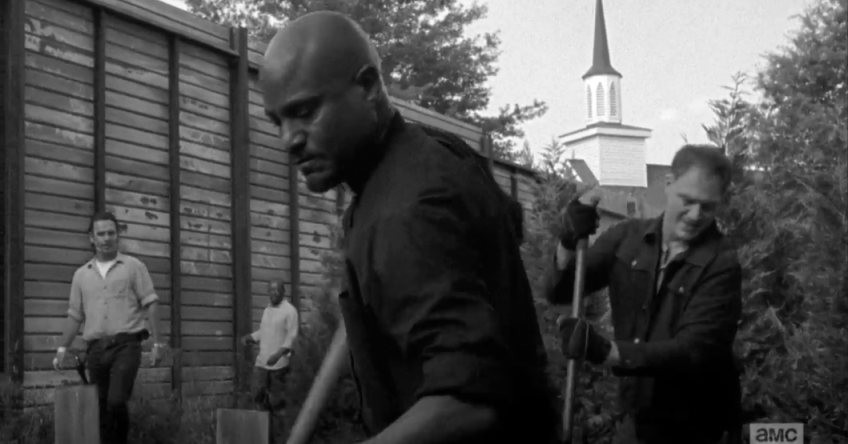 snarky rick grave 1 Published October 18, 2015 at 1059 × 555 in The Walking Dead, Season 6, Episode 1, “First Time Again” Snarky Rick comes up on Gabriel and Tobin, digging the graves for Reg’s and Pete’s bodies…and of course, Snarky Rick ain’t having it. No murderers get to rest underground within the precious real estate within Alexandria’s walls.