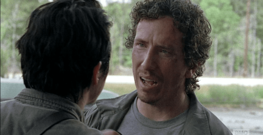 tractor store 4 Published October 21, 2015 at 1060 × 547 in The Walking Dead, Season 6, Episode 1, “First Time Again” Nicholas offers to help, cutting the walkers to four each, but Glenn is having none of it. He hands Nicholas the radio, instructs him to radio Rick if this goes south, and lead the tractor store walkers away.