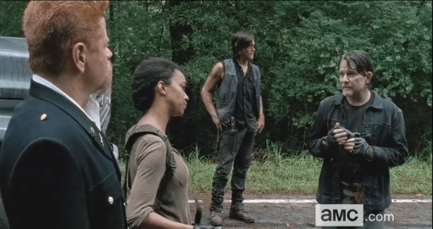 Next, it’s Sasha’s turn. Tapping Daryl’s handgun, Snidely steps up to Sasha Fierce, and she silently hands him her firearm. “Thank you,” he whispers, and Sasha lets out a small laugh, like, “Motherfucker, if I only could, your brains would be all over this asphalt right about now.”