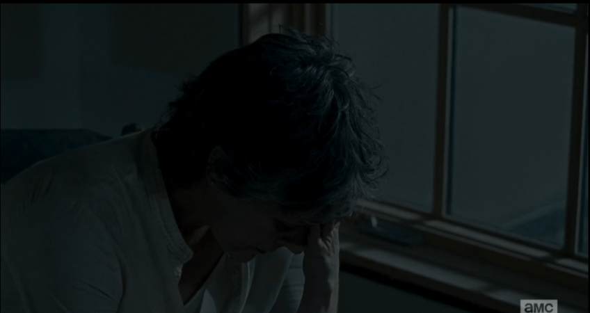 carol 1 Published February 25, 2016 at 1064 × 565 in TWD, Season 6, Episode 9, “No Way Out” Meanwhile, Carol has done a sweep of the brownstone, and looks out the window, upstairs, down at the streets filled with walkers. She sits down heavily, her head in her hand. She looks so over it.