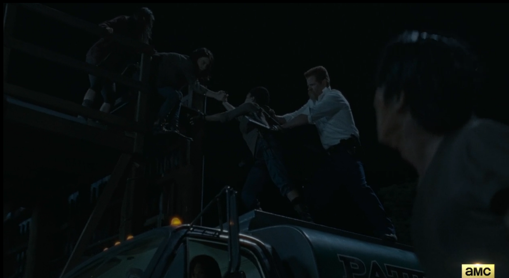 end 1 Published February 26, 2016 at 1041 × 569 in TWD, Season 6, Episode 9, “No Way Out” As Abraham, Sasha, and Enid help Maggie down onto Patty the fuel tanker…