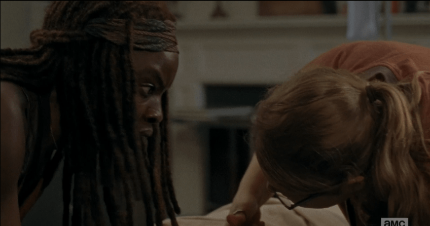 “He needs my help!” Michonne presses. “Just one more suture,” Doc Denise replies, working. “He’s out there!” Michonne cries.