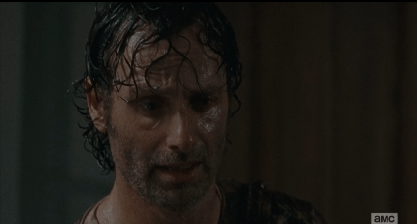 Denise’s voice, and the others’ voices, begin to drone out, sound further and further away as it all begins to close in on poor Rick. His son is gravely wounded, eye shot out, he just watched his girlfriend and her son get eaten alive by walkers, and he had to hack off his doomed gf’s arm to free his son…and then Carl took a bullet in the eye that was meant for Rick.
