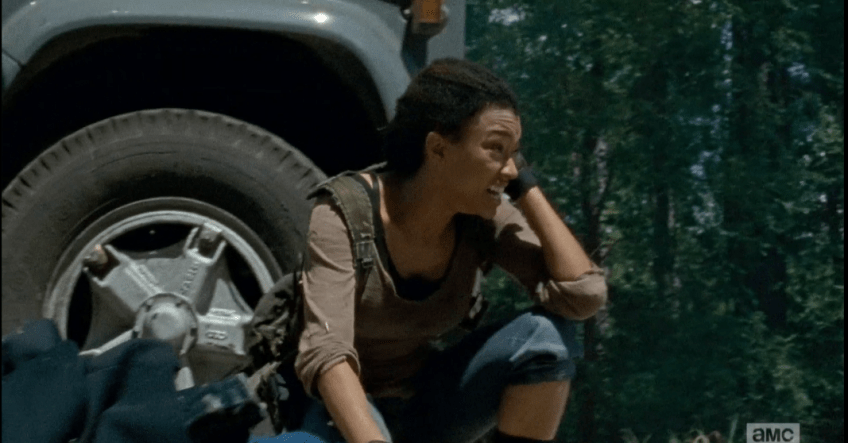 sasha covering ear gets up Published February 20, 2016 at 1067 × 558 in TWD, Season 6, Episode 9, “No Way Out” Coughing, sputtering, ears sure to be ringing, Sasha and Abraham survey the burning, blackened remains of Snidely and his biker gang.